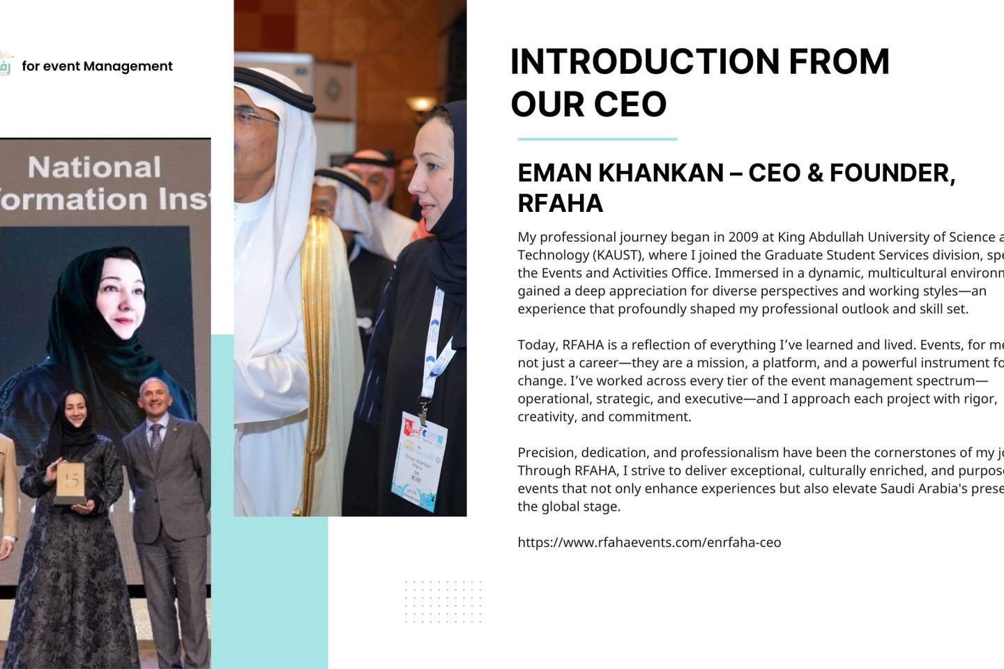 Precision, dedication, and professionalism have been the cornerstones of my journey. Through RFAHA, I strive to deliver exceptional, culturally enriched, and purpose-driven events that not only elevate experiences—but elevate Saudi Arabia on the global stage.